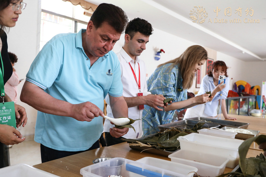 A group of foreign reporters and influencers based in China learned to make zongzi, or glutinous rice dumplings, on Friday in Weihai, East China's Shandong province, to familiarize themselves with Duanwu, or the Dragon Boat Festival, a traditional festival celebrated across China on the fifth day of the fifth month according to the lunar calendar.