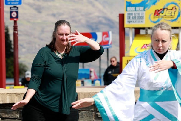 About 20 people demonstrated tai chi on the street in Queenstown, New Zealand on Oct 7.