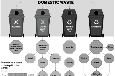 In Shanghai's Pujin subdistrict, sculptures made from beverage cans, bicycle tires and plastic bottles are displayed around a recyclable transfer center. This is where 17 trucks transport recyclables every week from 71 districts and nine villages near the center.