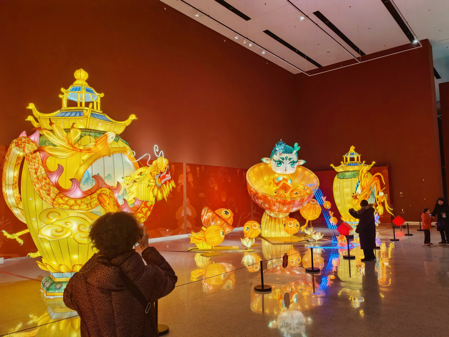 The themes of Zigong lantern shows are normally stories and characters from fairy tales, classic literature and folk customs. The lanterns now on at the Chinese Traditional Culture Museum depict dragon, the zodiac creature of the coming Chinese New Year, mythological animals mentioned in Shan Hai Jing (Classic of Mountains and Waters) and dinosaurs — Zigong is known as a trove of dinosaur fossils.