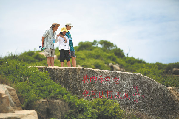 A family visits a large rock engraved with a child's poem on Dongshan Island, Fujian province, that reads: "My two hands empty, can still hold back the wind". [Photo provided to China Daily]