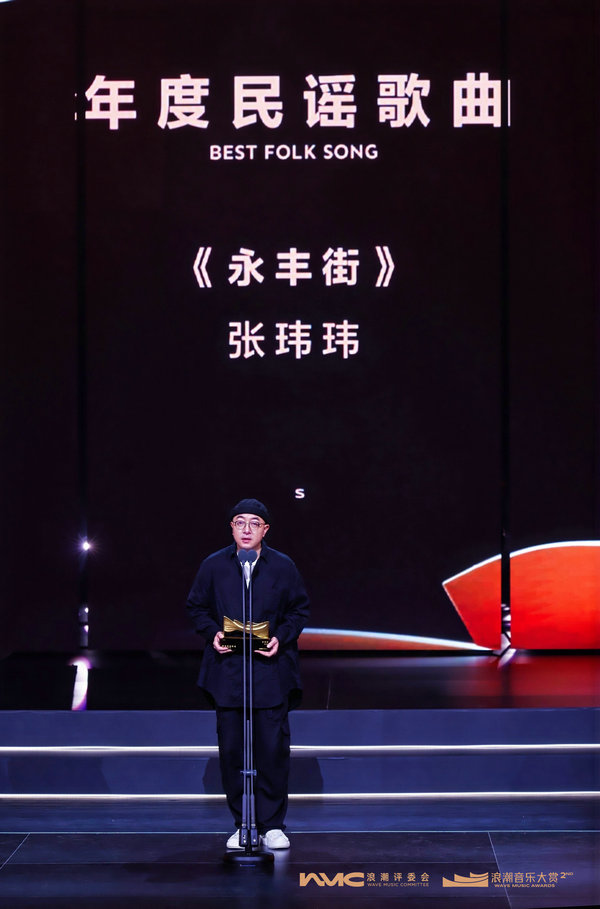 Folk singer-songwriter Zhang Weiwei receives the award, Best Folk Song of the Year, at the Wave Music Awards in Beijing. [Photo provided to China Daily]